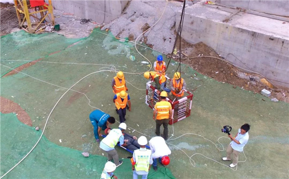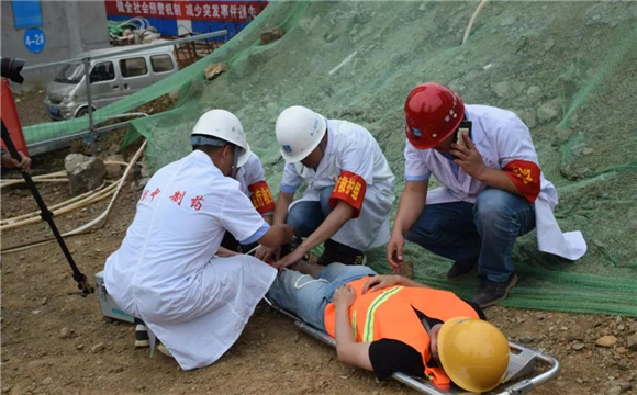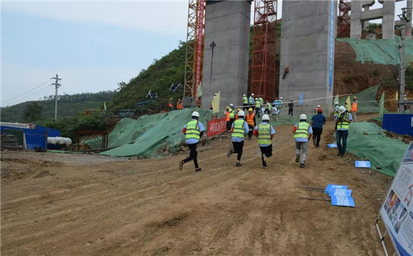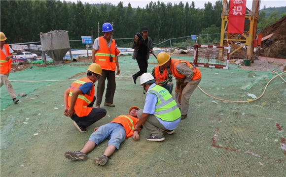 演练下午三点三十分钟准时举行,地点选择在高墩作业较密集的小阳坡大桥施工现场,模拟了施工人员不慎从高墩作业平台坠落的情景,现场专职安全员第一时间向应急救援领导小组组长报告,应急救援预案迅速启动。